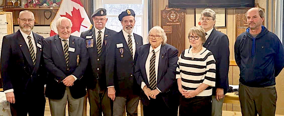 (L-R) Gerry Tilmans, 1st VP and PRO; Don Colter, 2nd VP, Lottery and Maintenance; Kim White, Sergeant-At-Arms, Bar, Youth Ed,. Track & Field; Chris Mawdsley (me), President; Sharron Colter, Secretary; Karin Webb, Treasurer; Dawn Spence, Veteran’s Service Officer (VSO); John Bell, Branch Sports Chair.(Absent Mark Johnson, Poppy Chair)