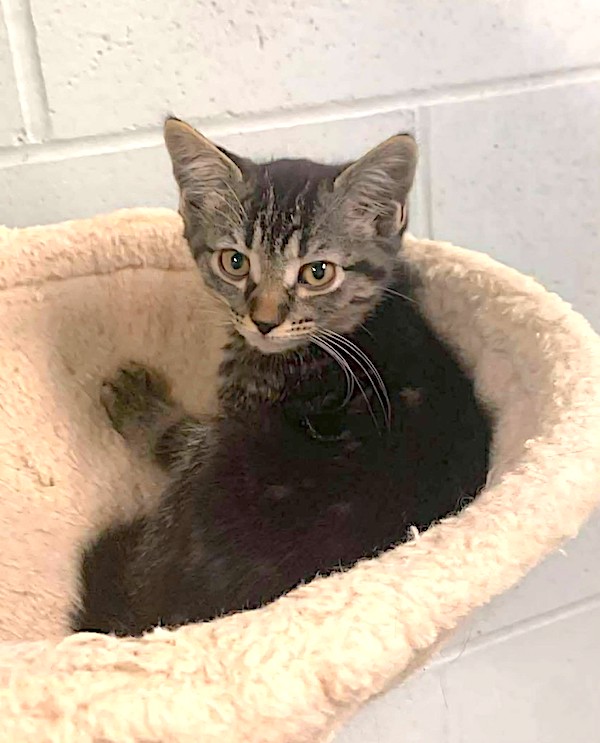 This sweet mom and her kittens are looking for their forever homes. but can all be adopted separately. Meet Kitty, approximately one-year-old, a black DSH, and her tabby babies, Lily and Phil, approximately eight weeks old.